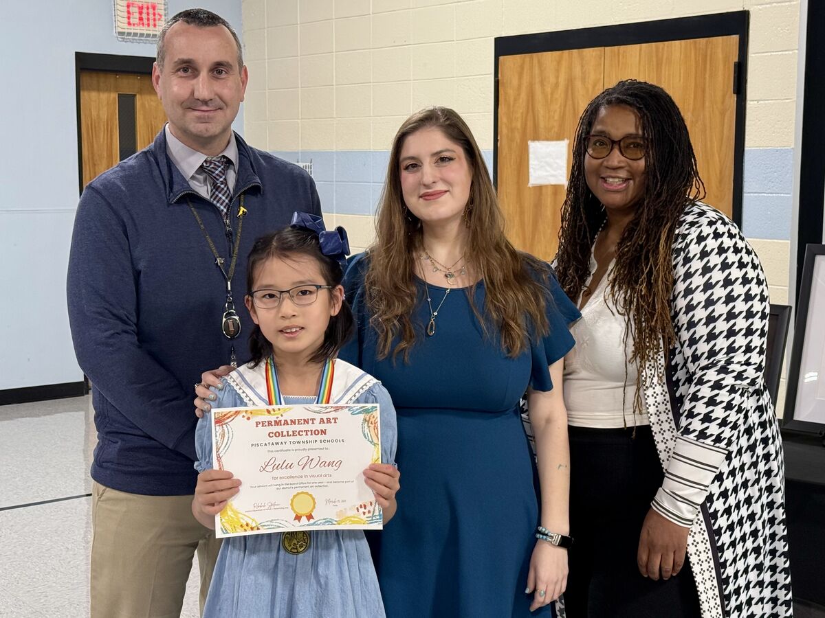 Congratulations to Lulu Wang, whose artwork was selected to be included in the district's Permanent Art Collection! A student from each K-8 school was celebrated on Thursday, March 13, along with their families in a ceremony at our Administration Building. The event displaying their beautiful artwork was hosted by Supervisor of Visual & Performing Arts Rebekah Sterlacci and attended by the Board of Education, district administration, and the students’ principals and art teachers.